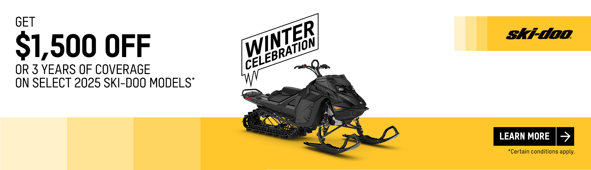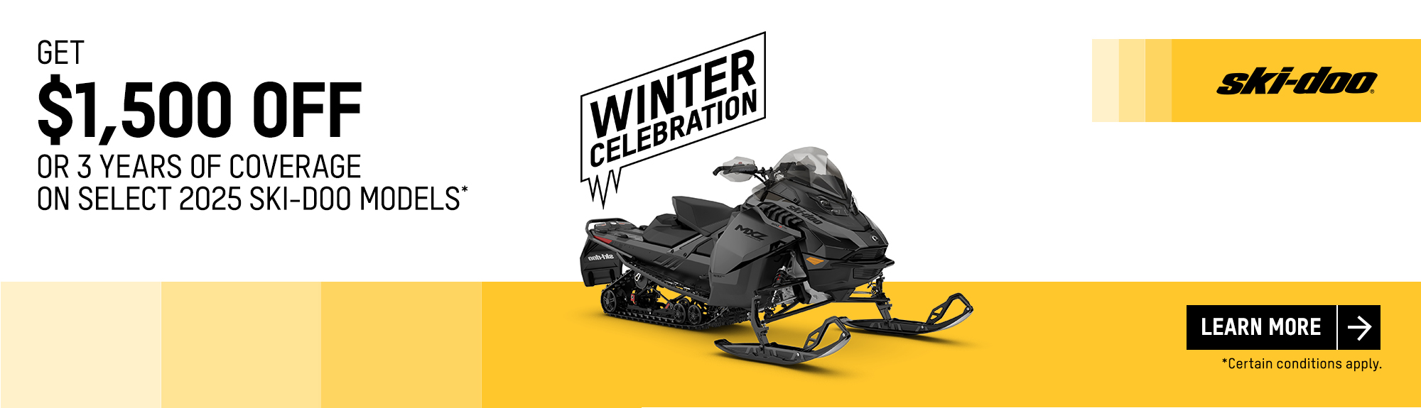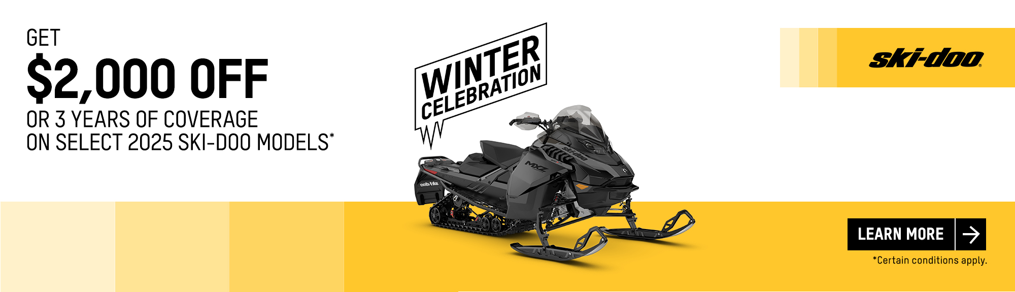Get a rebate up to $1,500 or 3 years of coverage or financing starting at 1.99% for 36 months on select 2025 Ski-Doo and Lynx models (deep snow)