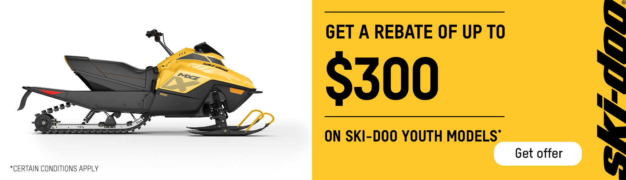 † Get a $300 rebate : Consumers who purchase a new and unused 2026 Youth Ski-Doo model during the promotional period are eligible for a $300 rebate.
