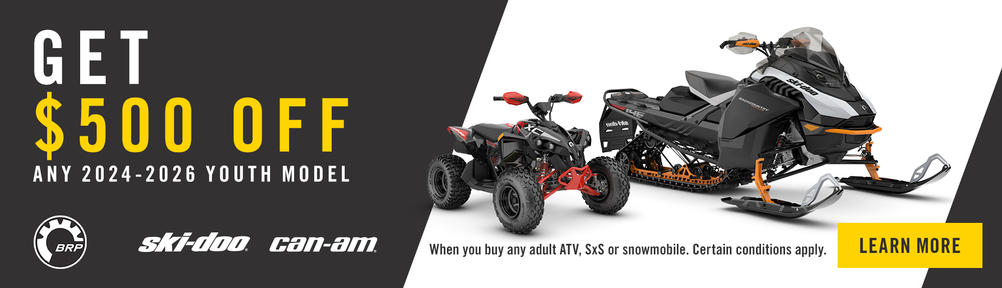 ©2025 Bombardier Recreational Products Inc. (BRP). All rights reserved. ®, ™ and the BRP logo are trademarks of BRP or its affiliates. In the U.S.A., products are distributed by BRP US Inc. Offers valid in U.S.A. only from November 1, 2025 to March 31, 2026. The conditions may vary depending on your location and this offer is subject to termination or change at any time without notice. This offer is not refundable, exchangeable or transferable (including from one dealership to another), cannot be redeemed for cash, credit or other products of equivalent value and cannot be combined with any other offer or rebate. Null where prohibited by law. Until supplies last. Returns of any portion of the purchase will require equal forfeiture of offer or amount equal to the offer. Eligible models are new and unused 2024-2026 Can-Am ATV or Ski-Doo Youth models.
